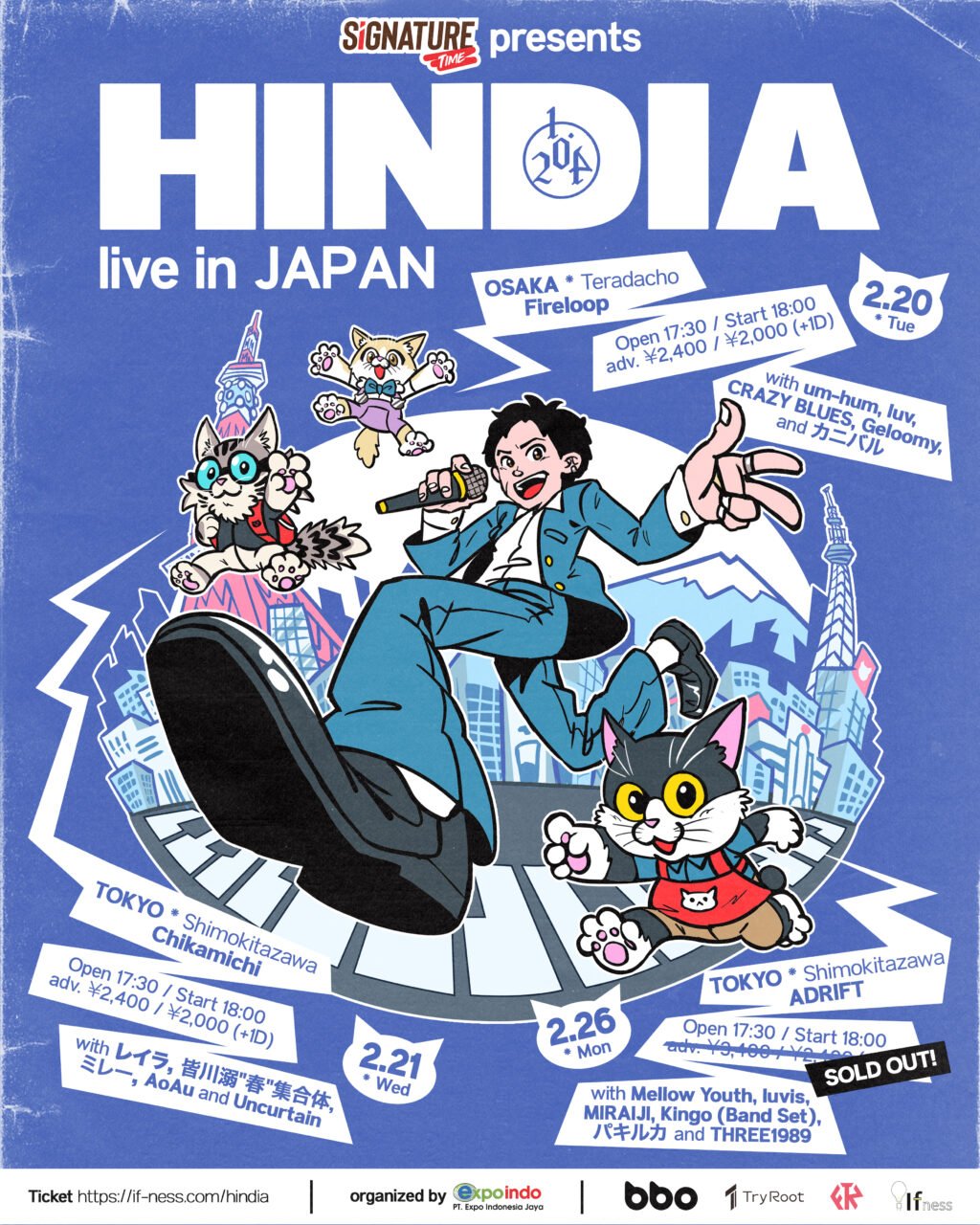 Setelah Singapura, Malaysia, Taiwan dan Australia, kini negeri matahari terbit dapat giliran disambangi Hindia dalam tur “Hindia Live ini Japan” diselenggarakan oleh IFNESS Entertainment yang akan diadakan di Fireloop, Osaka (20/02), Chikamici, Tokyo (21/02) dan Adrift, Tokyo (26/02). Di masing-masing titik akan dimeriahkan oleh musisi-musisi jepang seperti um hum, geloomy, カニバル(Cannnibal), mellow youth, レイラ (Leila), kingo, Miraiji dan masih banyak lagi.